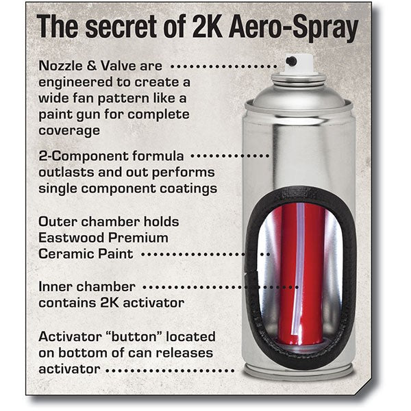 Eastwood’s 2K Aerospray “Urethane Primer Gray” High Temp Ceramic Engine Paints combine the durability and professional results of 2 part paints with the ease of application of a spray can